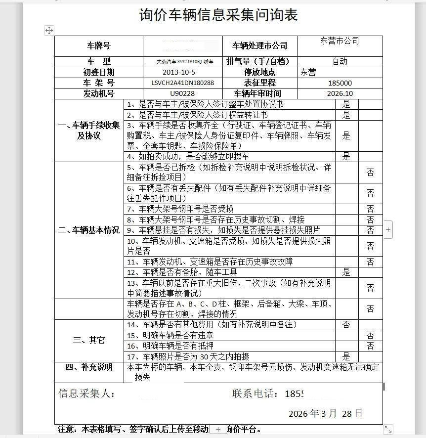 该车于2026年3月20日停放于东营保全地,残值拍卖完成后收取固定停车费1000,5天以内提车不额外收取停车费。超5天未提车,按实际停放天数*30元每天收取停车费。发动机变速箱未见明显受损,无违章,无改装拼色,大架号无损,铭牌无损,无抵押 5年以上车辆报价后不得以二次事故为由提出议价或退车弃标。