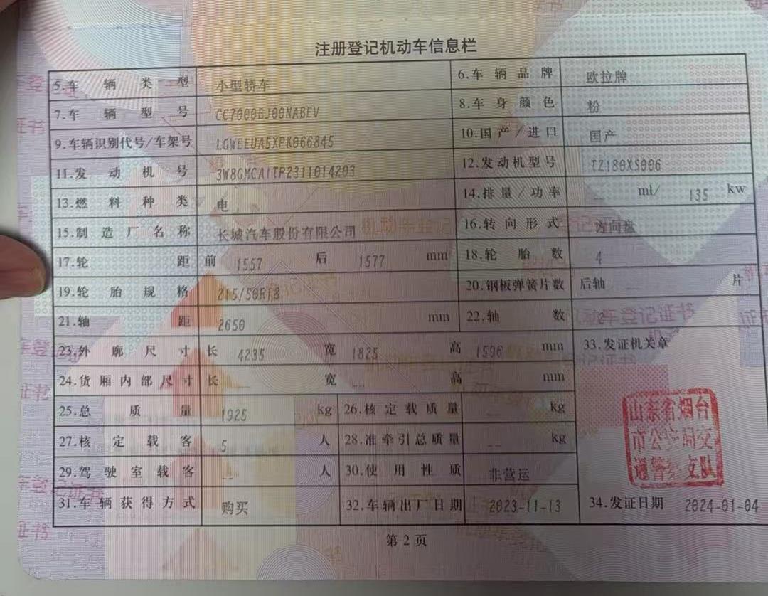 初次登记日期 2023-11-13 车辆名称 欧拉牌