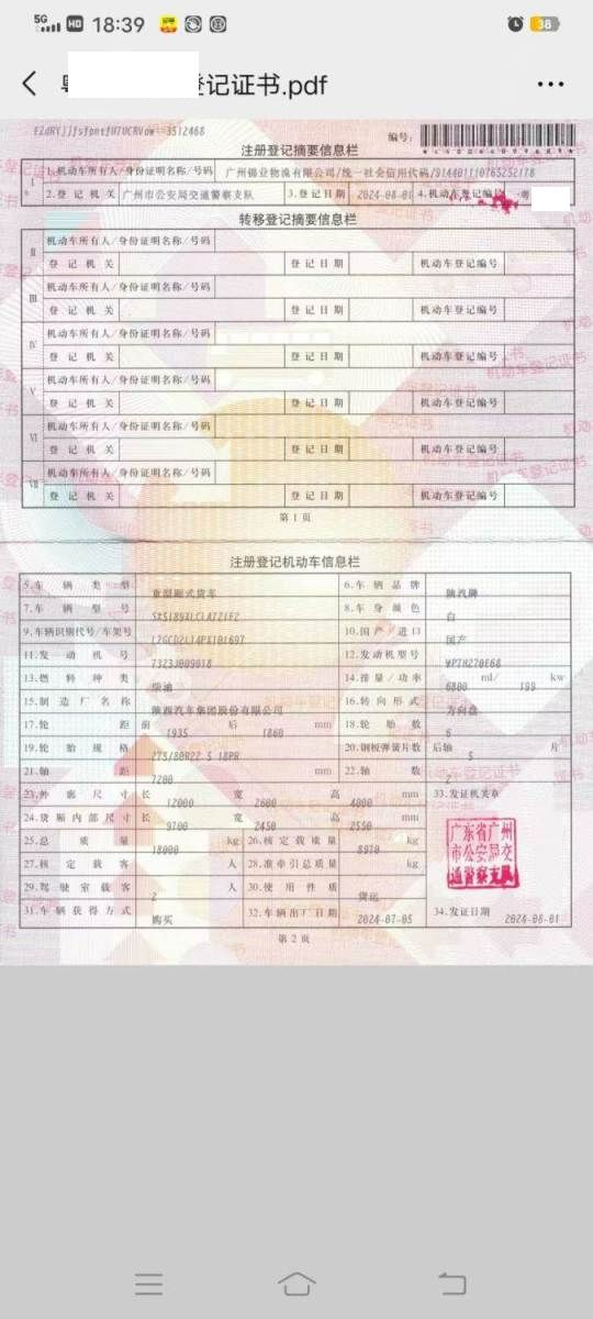 初次登记日期 2024-08-01 车辆名称 陕汽牌