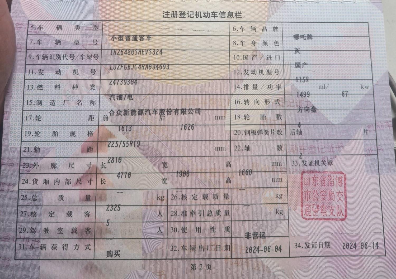 初次登记日期 2024-06-14 车辆名称 哪吒汽车 哪吒