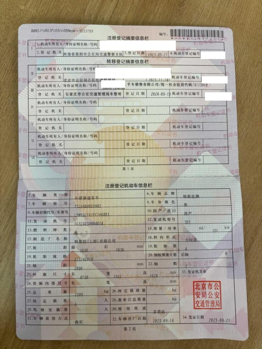 初次登记日期 2023-09-21 车辆名称 特斯拉 Model