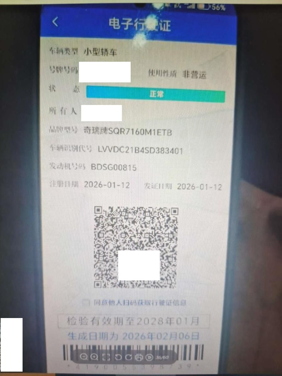 初次登记日期 2026-01-12 车辆名称 奇瑞牌