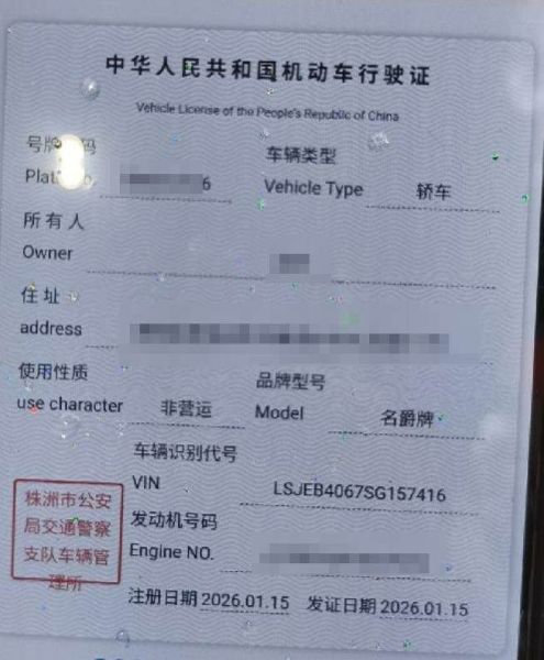 初次登记日期 2026-01-15 车辆名称 名爵 MG4