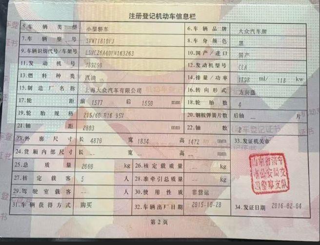 初次登记日期 2016-02-04 车辆名称 大众 帕萨特