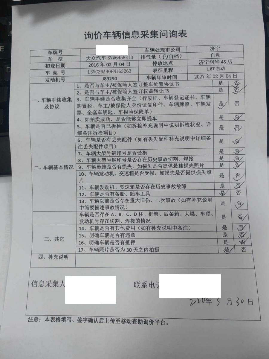 车架号是否受损 未知 使用性质 非营运