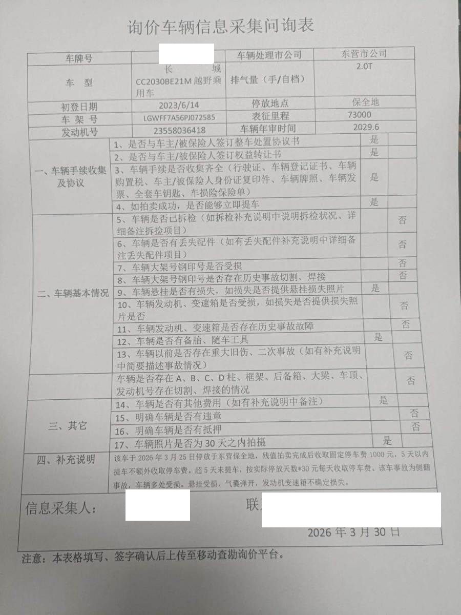 该车于2026年3月25日停放于东营保全地,残值拍卖完成后收取固定停车费,5天以内提车不额外收取停车费。超5天未提车,按实际停放天数每天收取停车费。该车事故为侧翻事故,车辆多处受损。悬挂受损,气囊弹开,发动机变速箱不确定损失。单位车辆 二手车交易费发票金额低于拍卖成交金额开具(不含手续费及其他费用)。