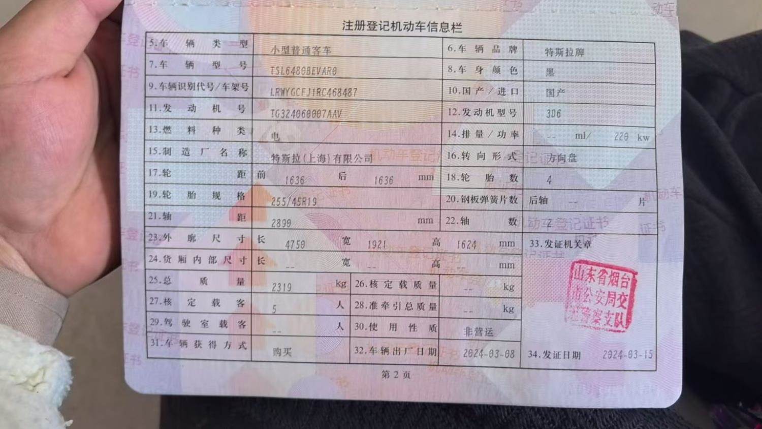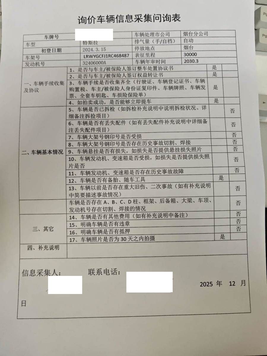 初次登记日期 2024-03-15 车辆名称 特斯拉 Model