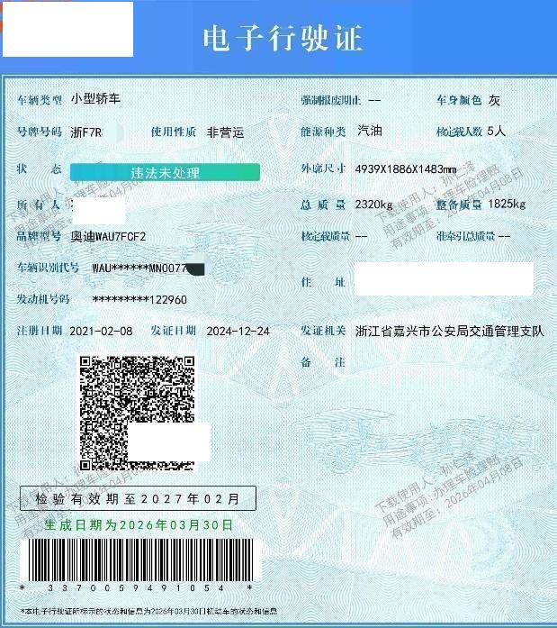 车牌号 浙****** 品牌 奥迪