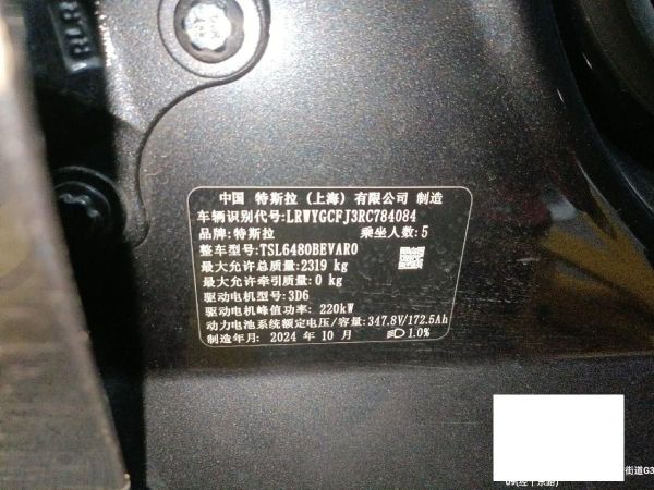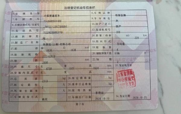 初次登记日期 2024-10-25 车辆名称 特斯拉 Model