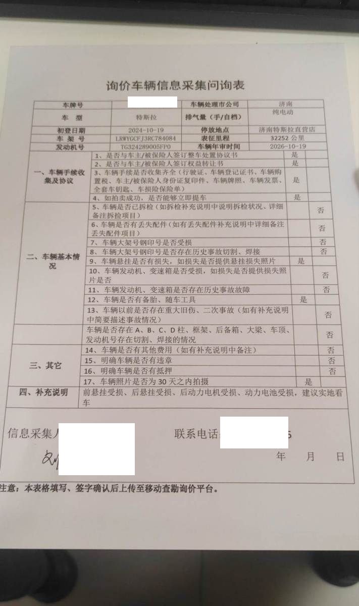 实际车型,2024款Y后轮驱动版,前悬挂受损、后悬挂受损、后动力电机受损、动力电池受损,建议实地看车