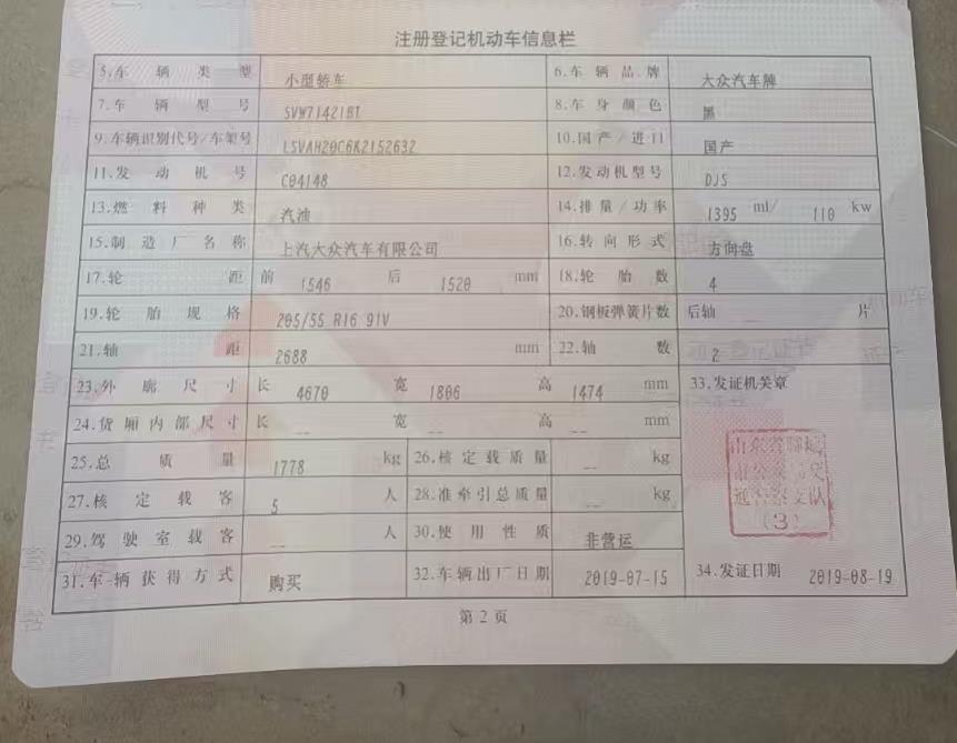 初次登记日期 2019-08-19 车辆名称 大众 朗逸