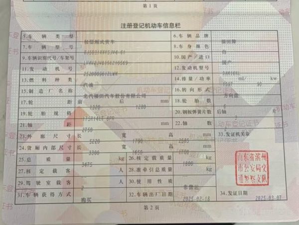 初次登记日期 2025-03-07 车辆名称 福田 祥菱M