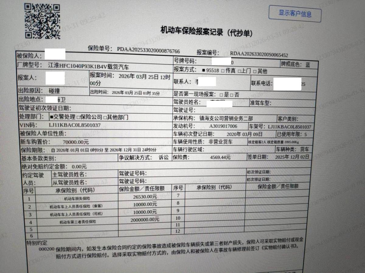 保险金额 ¥26530 预估维修金额 13000