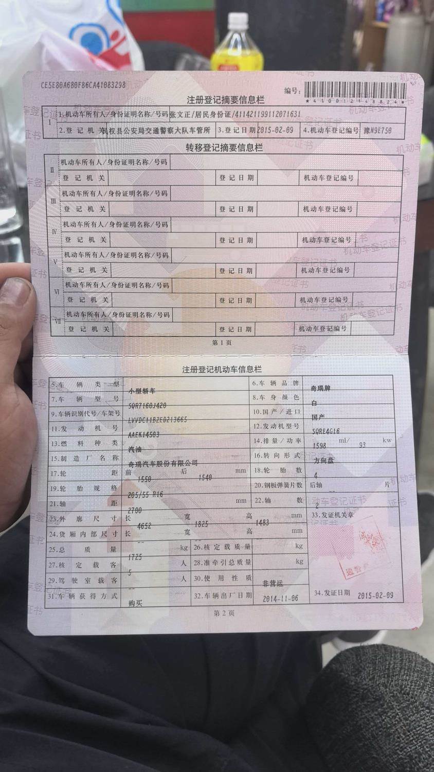 车牌号 豫****** 品牌 奇瑞