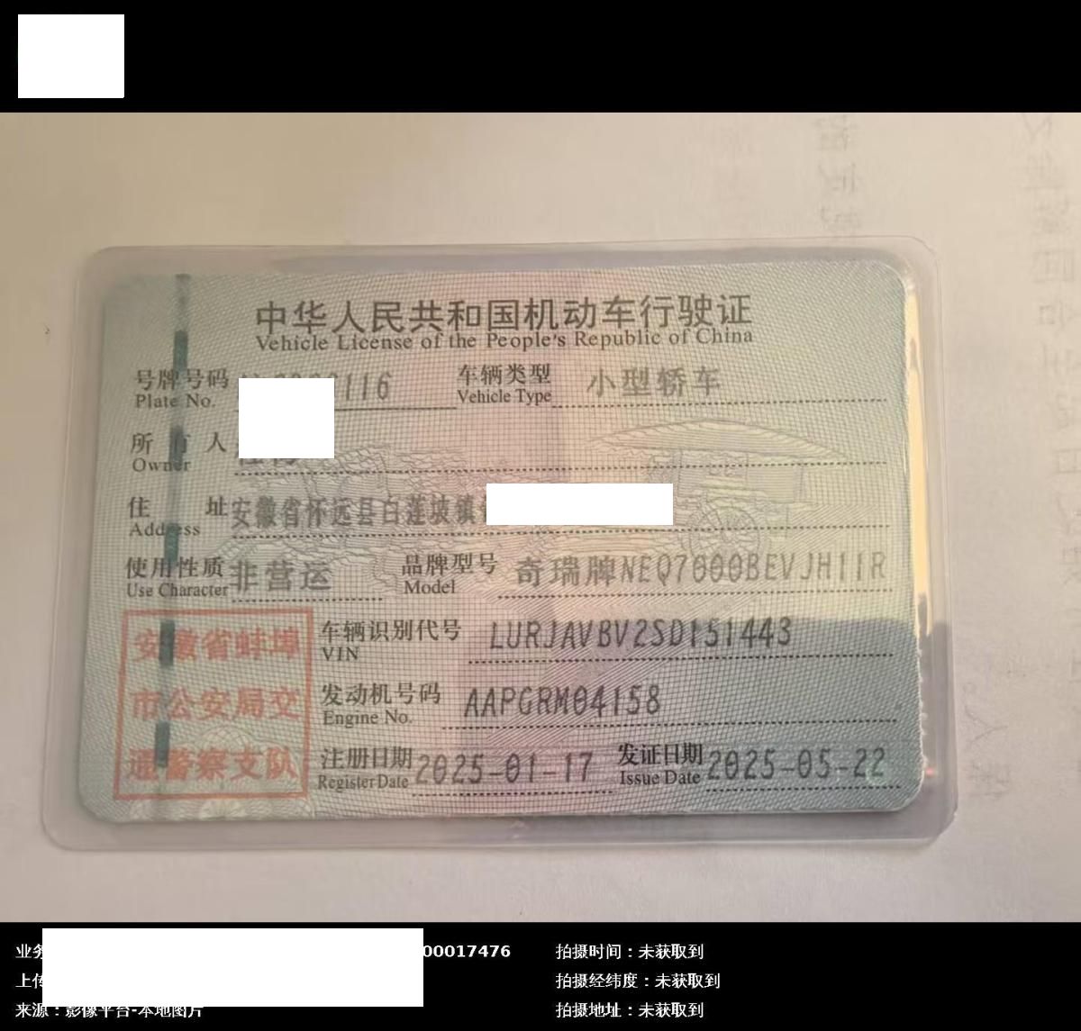 车辆归属地 安徽省蚌埠市 车辆停放仓库 安徽省蚌埠市怀远县