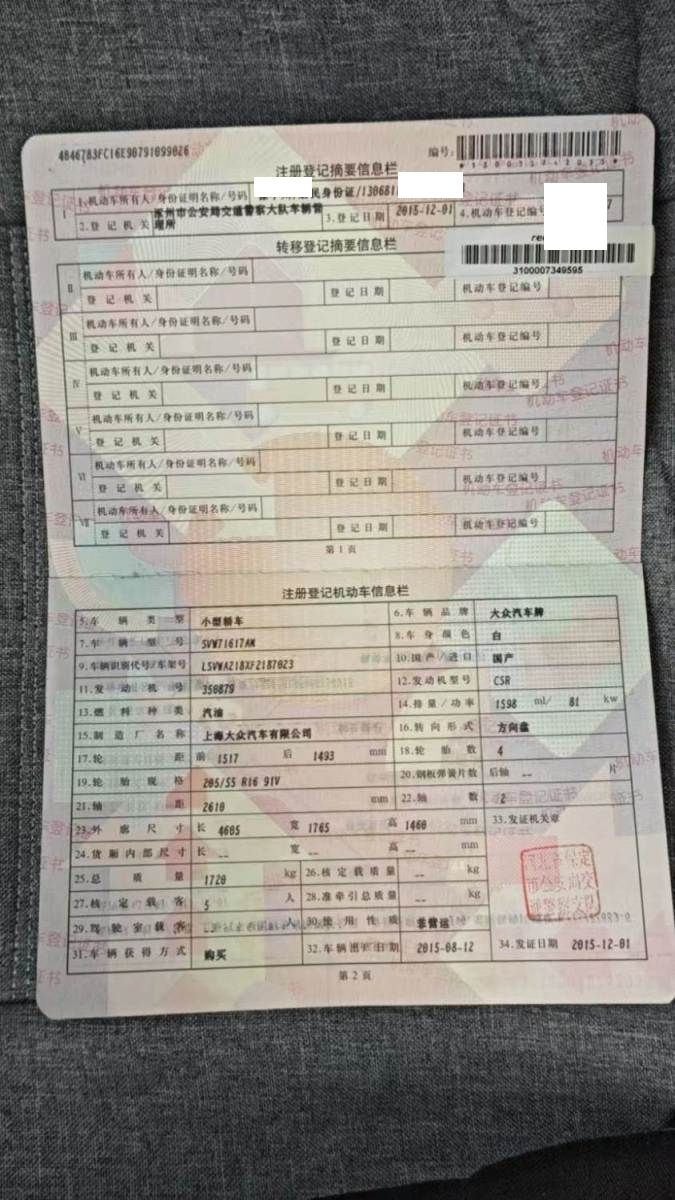 初次登记日期 2015-12-01 车辆名称 大众 朗逸