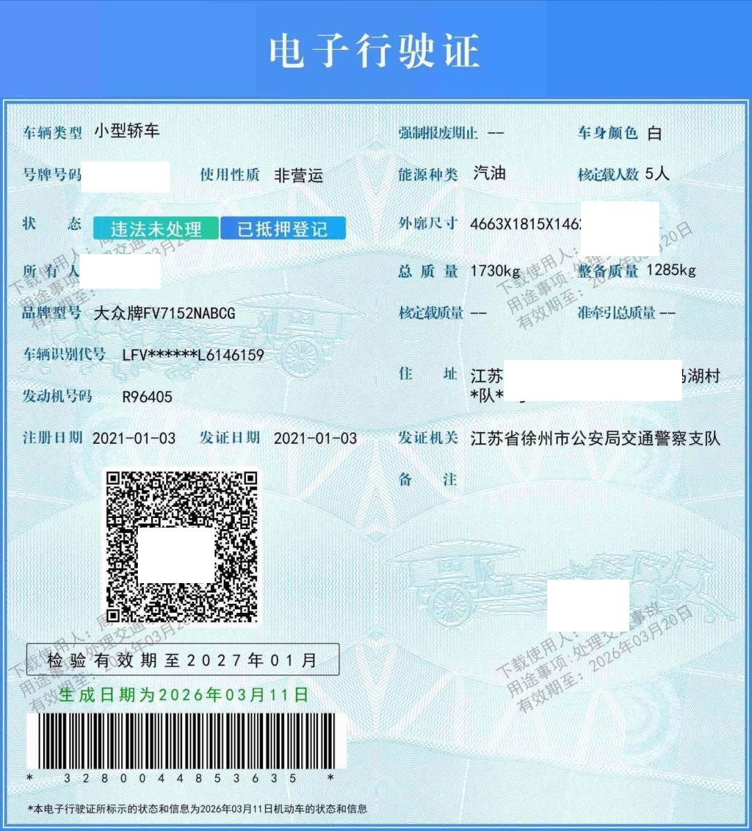 初次登记日期 2021-01-03 车辆名称 大众 宝来
