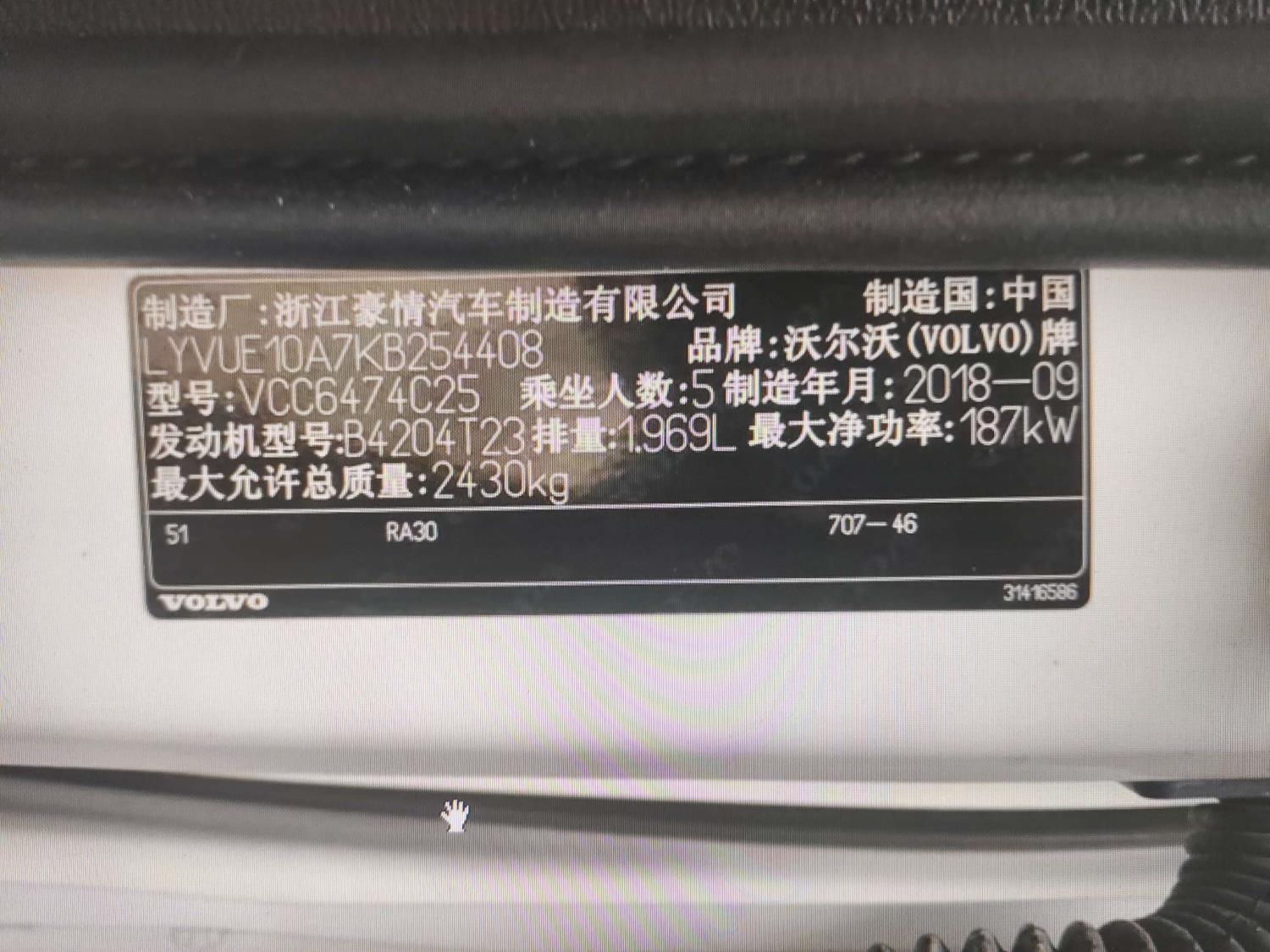 底盘号码 LYVUE10A7KB254408 变速箱类型 手自一体