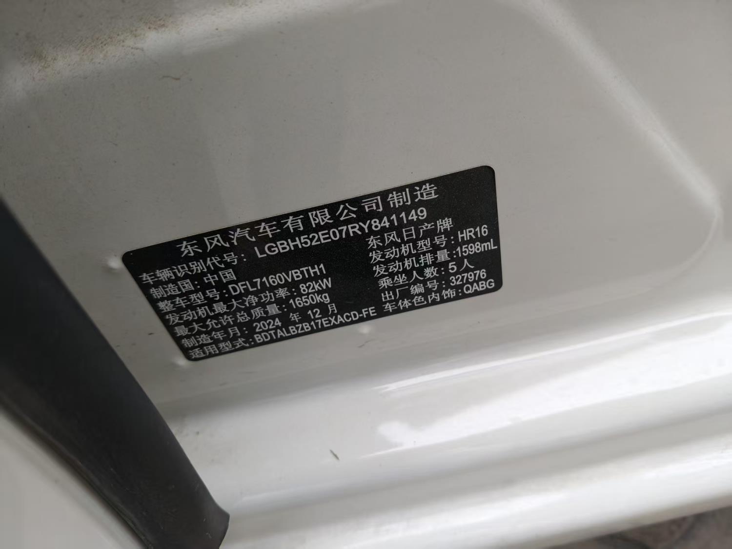 底盘号码 LGBH52E07RY841149 变速箱类型 自动