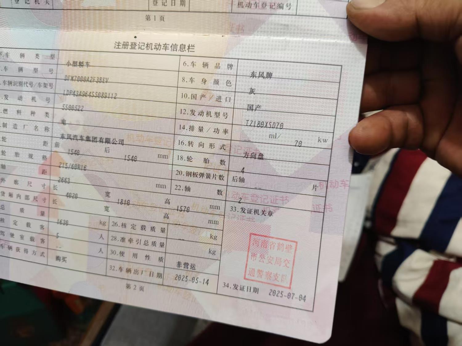 初次登记日期 2025-07-04 车辆名称 东风奕派