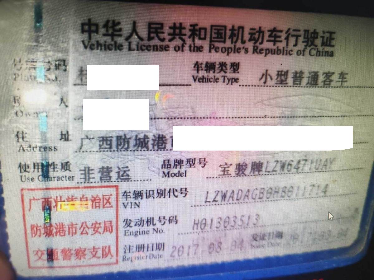 初次登记日期 2017-08-04 车辆名称 宝骏牌