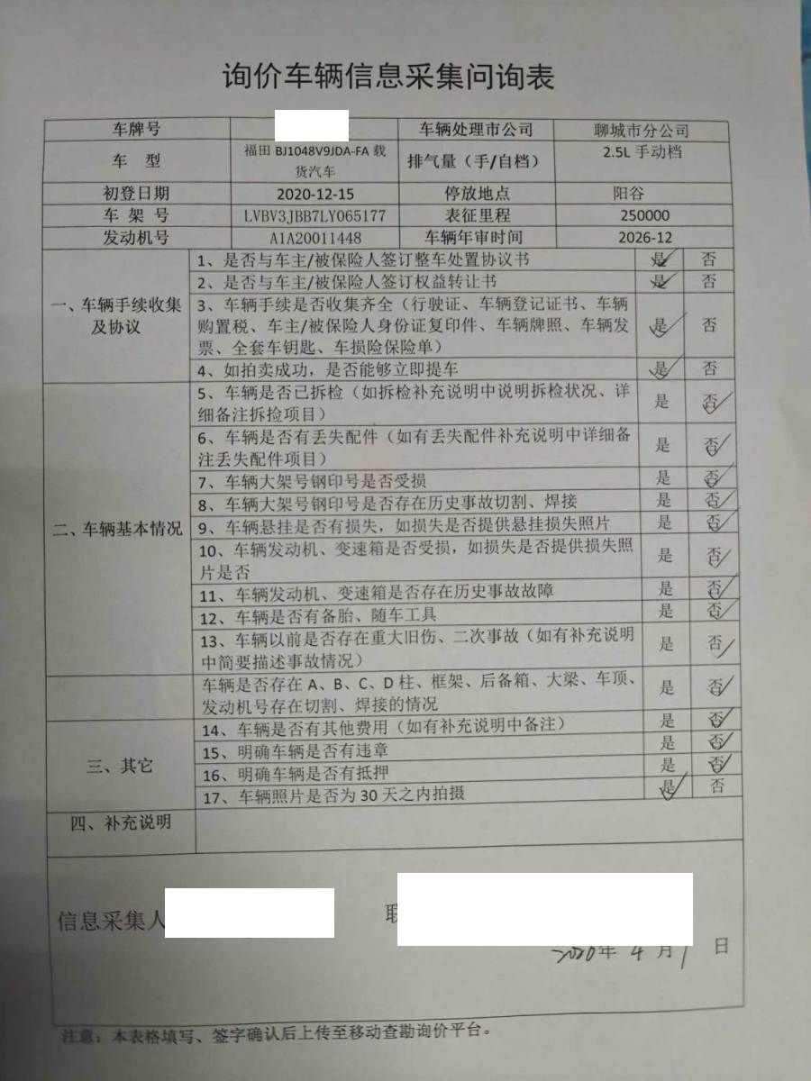 车架号是否受损 未知 使用性质 货运