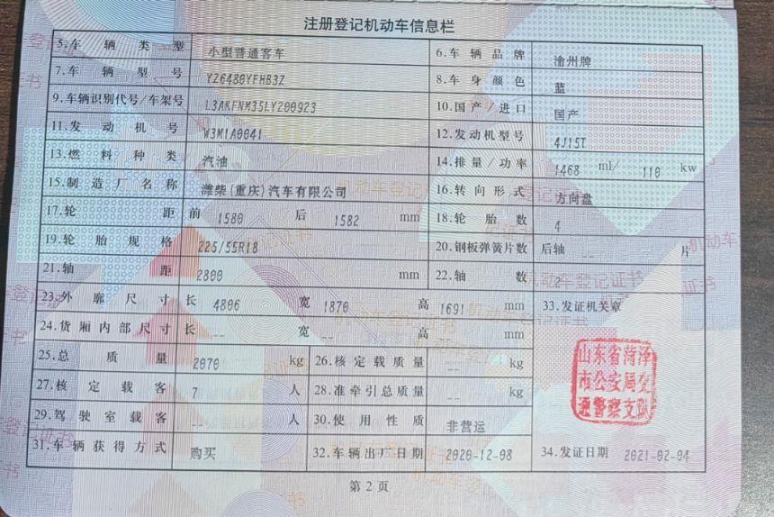 车牌号 鲁****** 品牌 五菱