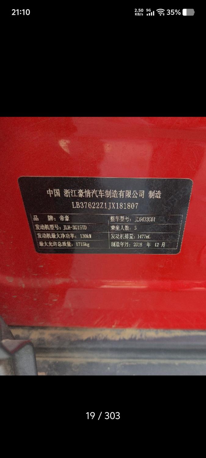 初次登记日期 2019-01-07 车辆名称 吉利汽车