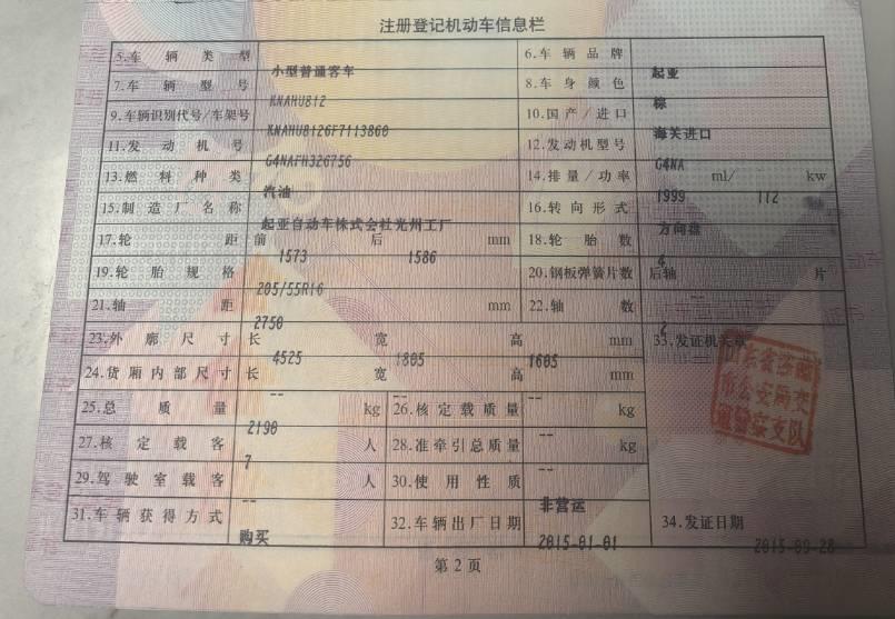 初次登记日期 2015-09-28 车辆名称 起亚 佳乐
