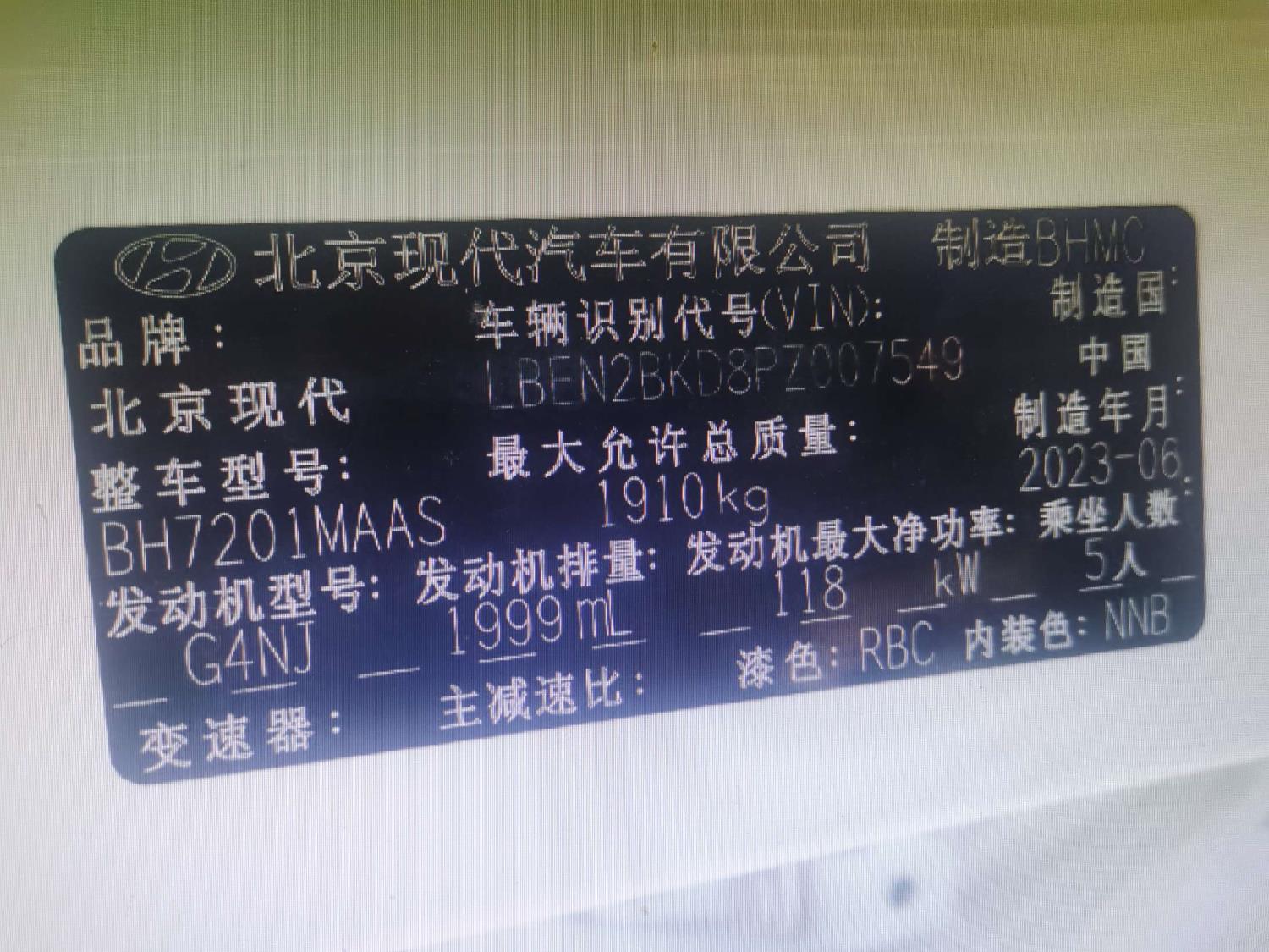 底盘号码 LBEN2BKD8PZ007549 变速箱类型 自动
