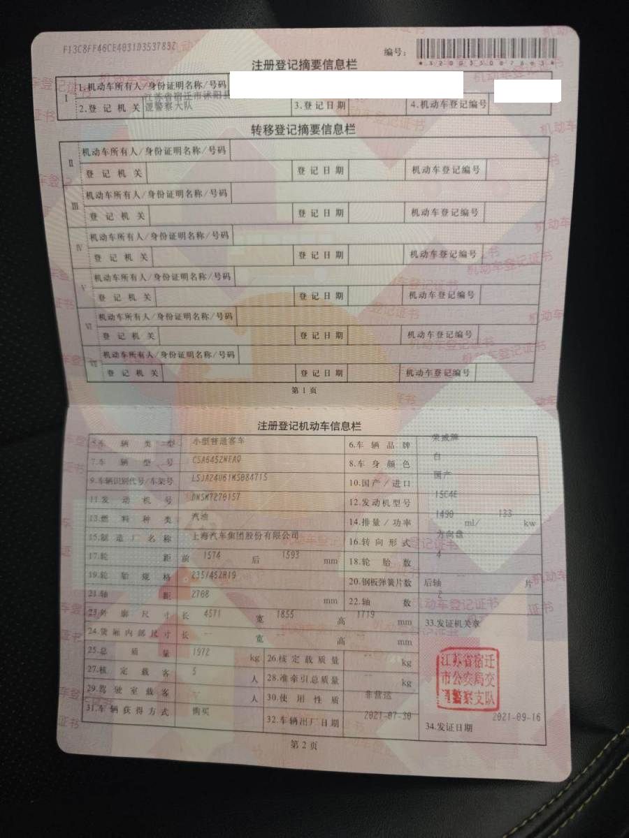 初次登记日期 2021-09-16 车辆名称 荣威RX5