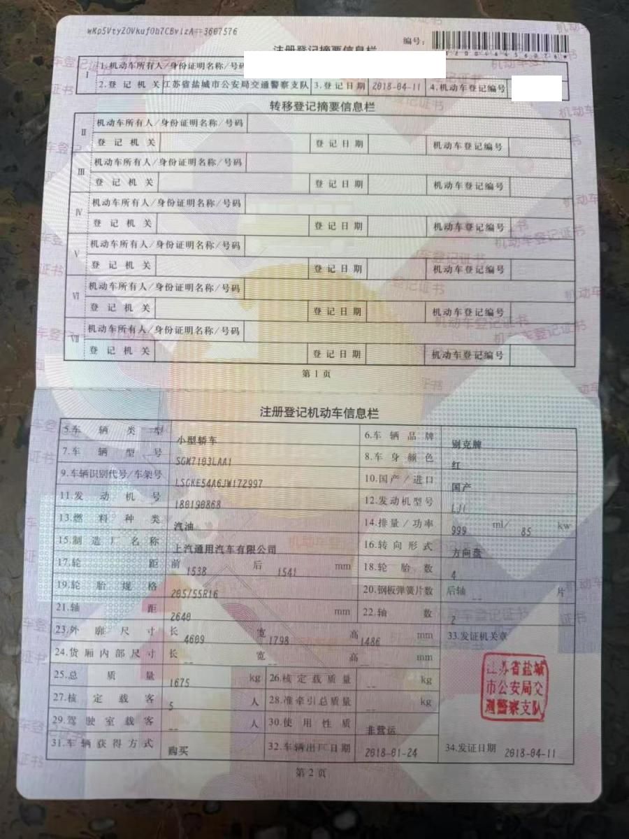 初次登记日期 2018-04-11 车辆名称 别克 英朗