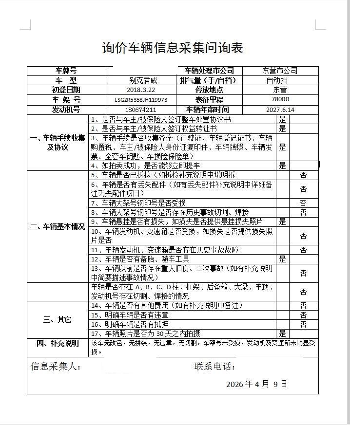 该车无改色,无拼装,无违章,无切割,车架号未受损,发动机及变速箱未明显受损。 5年以上车辆报价后不得以二次事故为由提出议价或退车弃标。