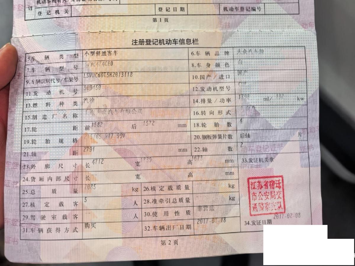 初次登记日期 2017-02-08 车辆名称 大众 途观L