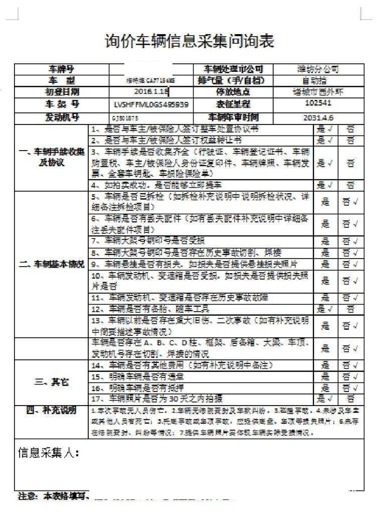 车架号是否受损 未知 使用性质 非营运