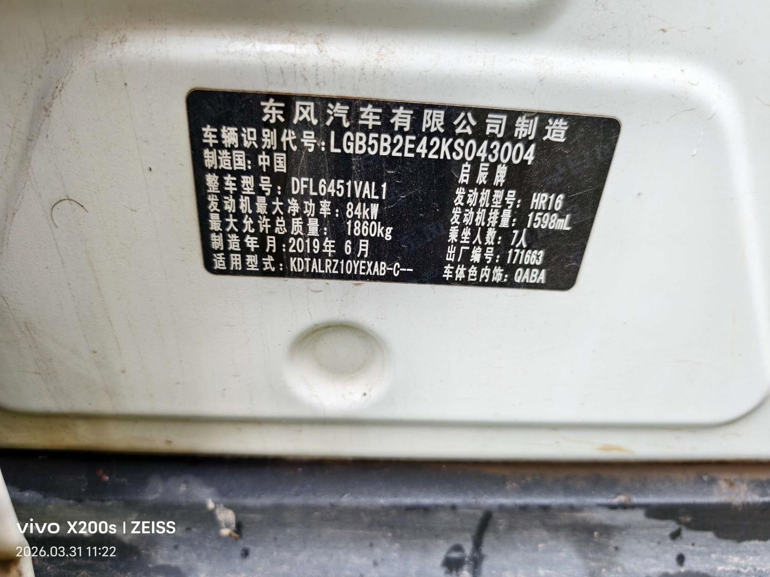 底盘号码 LGB5B2E42KS043004 变速箱类型 自动