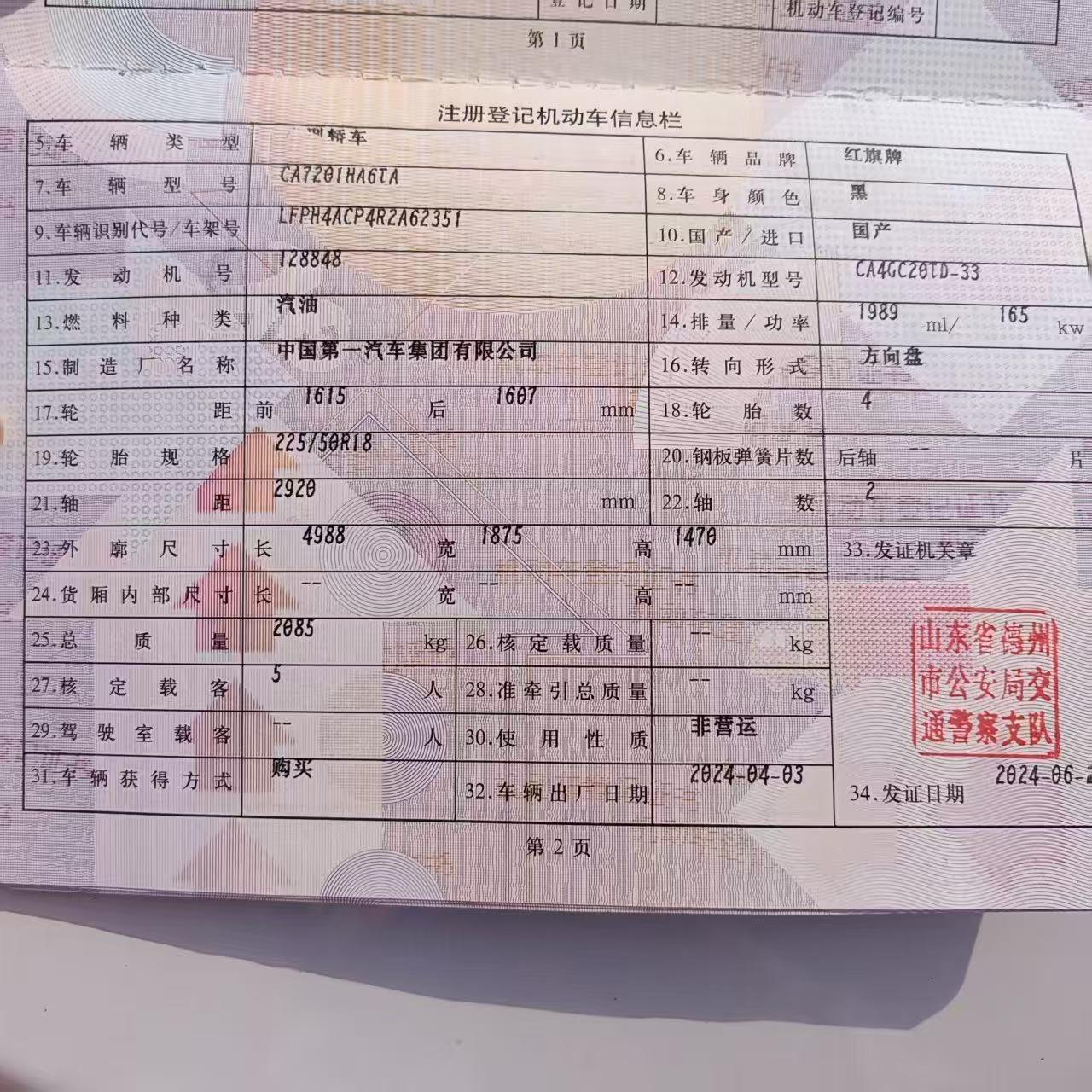 初次登记日期 2024-06-24 车辆名称 红旗牌