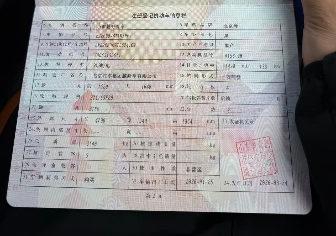初次登记日期 2026-03-24 车辆名称 北京越野