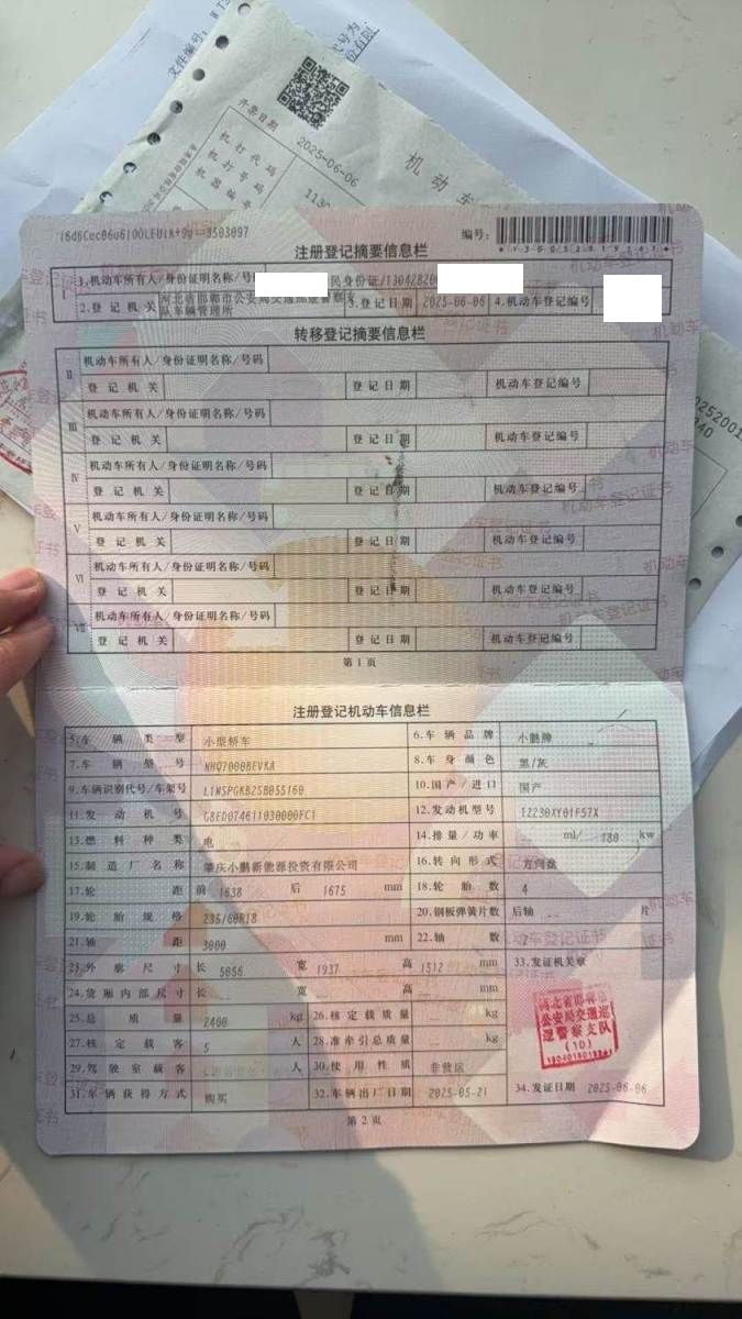 初次登记日期 2025-06-06 车辆名称 小鹏牌