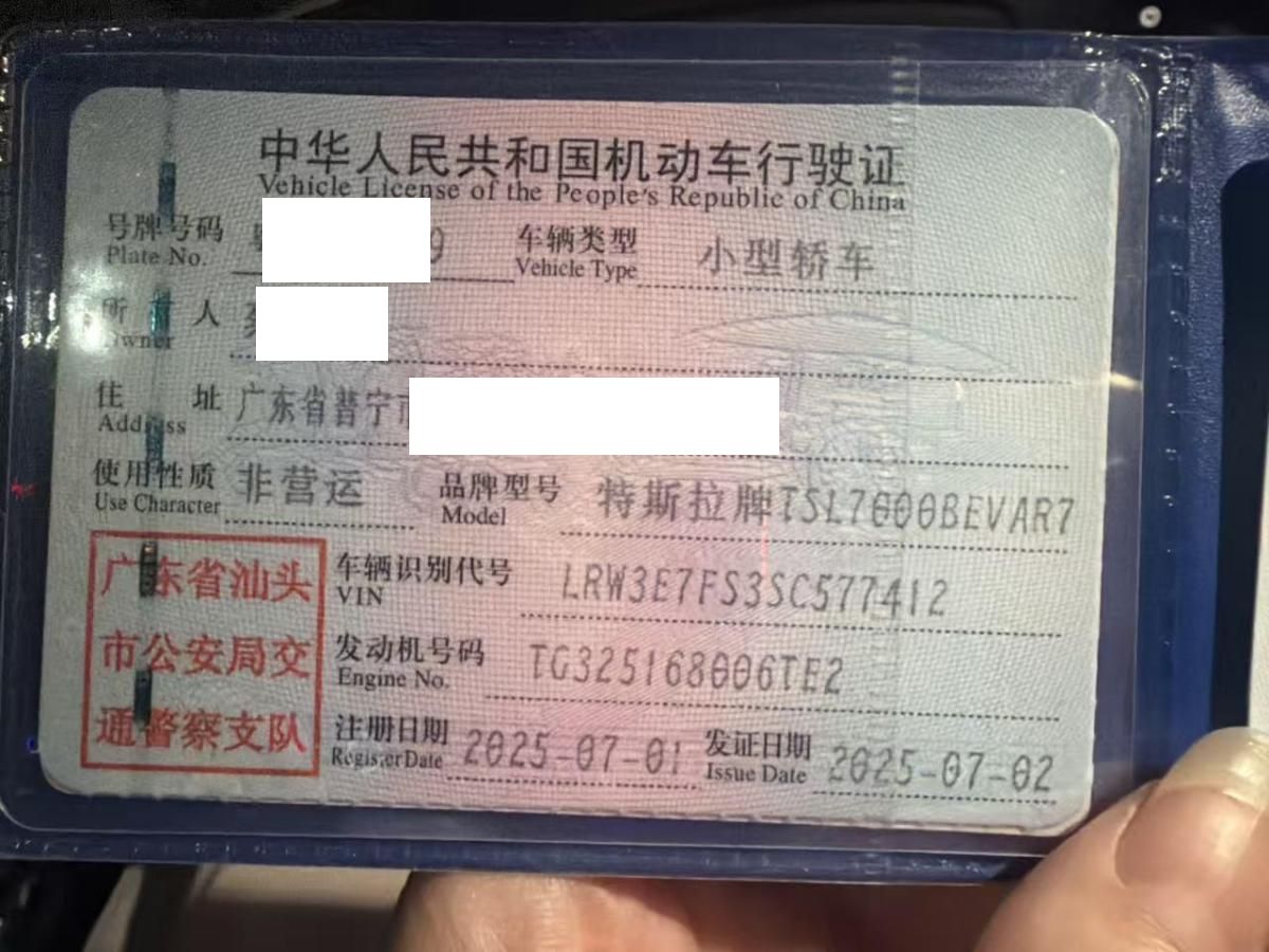 初次登记日期 2025-07-01 车辆名称 特斯拉 Model